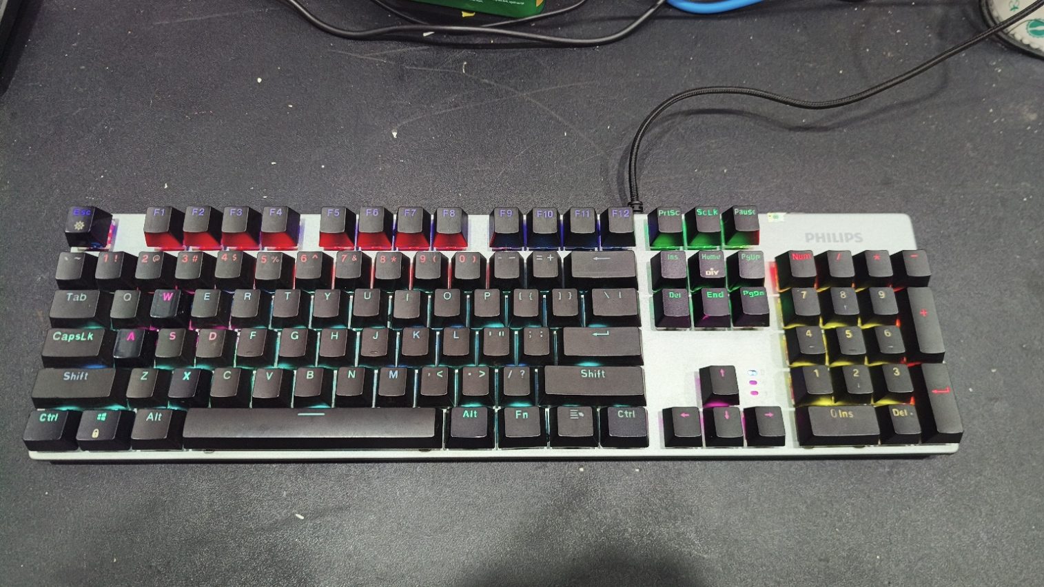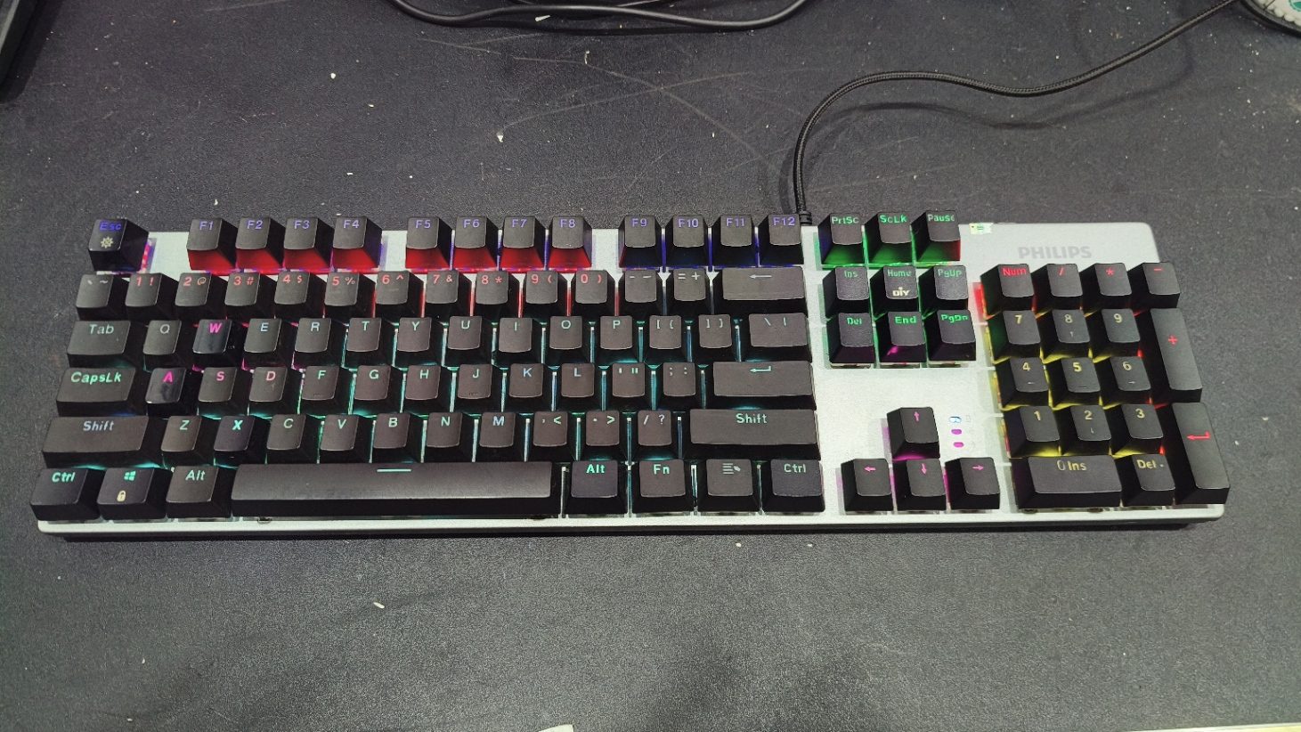 – Bàn phím Philips SPK 8404 cũ được sử dụng LED rainbow chia vùng kèm vớ kepcap xuyên led đem tới màu sắc đẹp và đủ để bạn trang trí trên bàn làm việc của mình